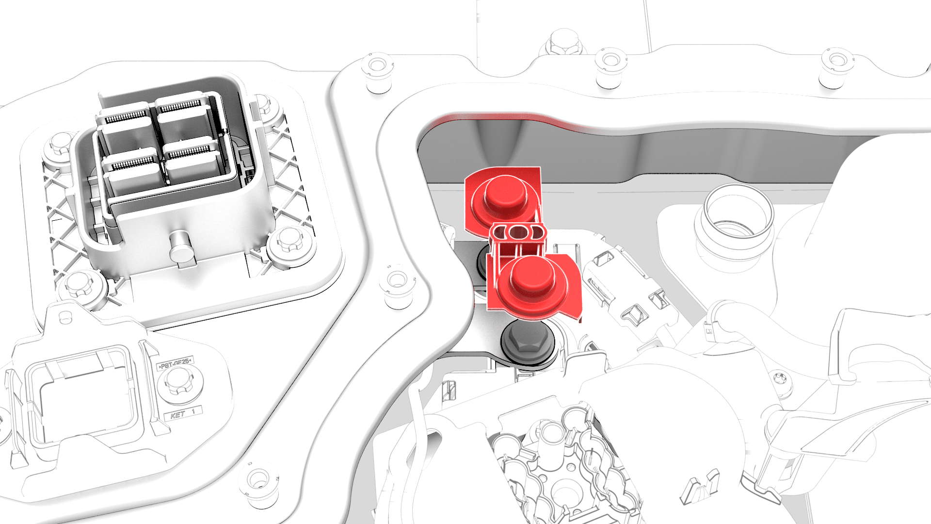 - Install the squarish insulator caps onto the pyrotechnic battery disconnect busbar bolt heads.