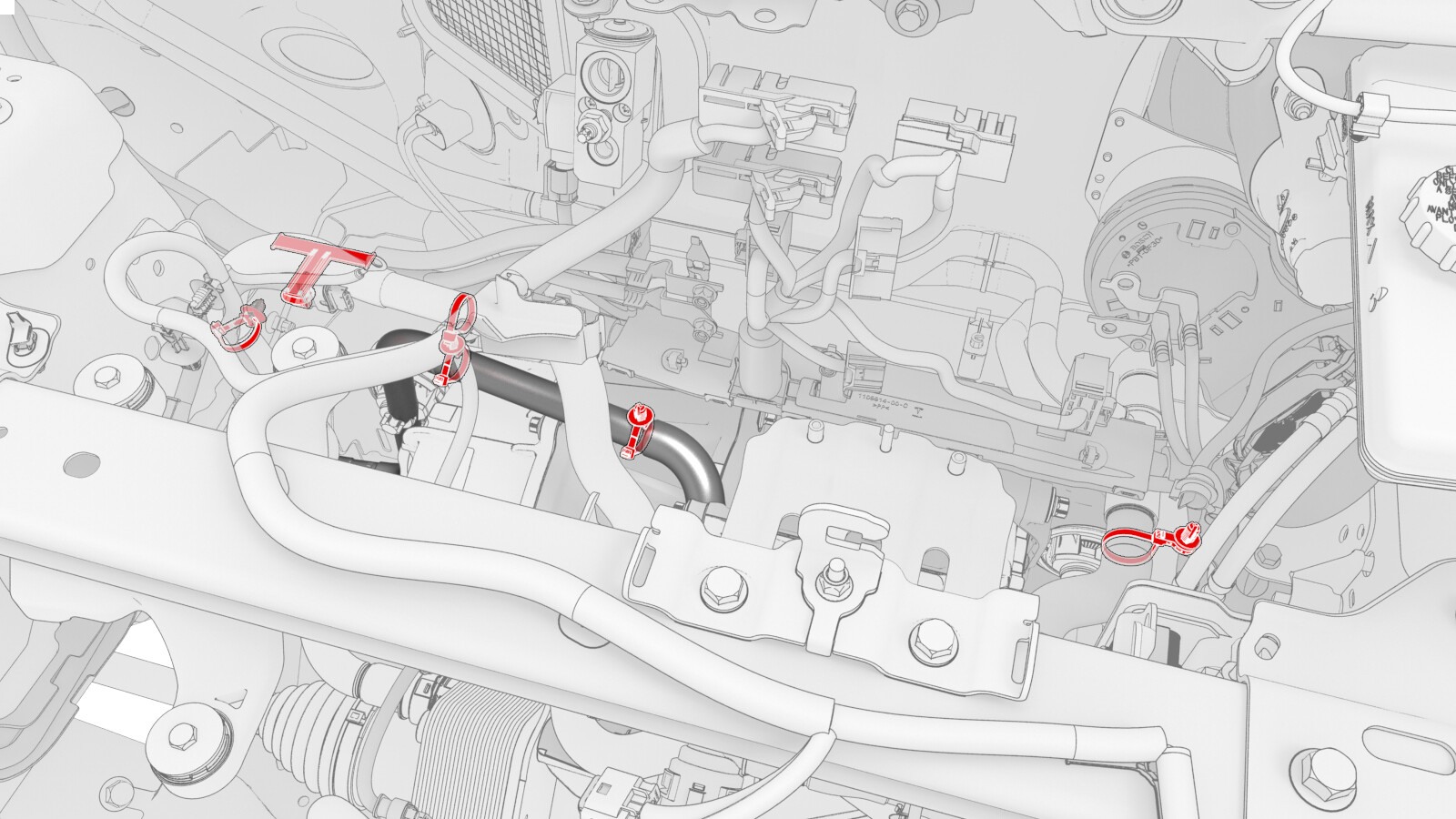 - Release the clips that attach the coolant hoses and electrical harnesses to the 12V battery beam.