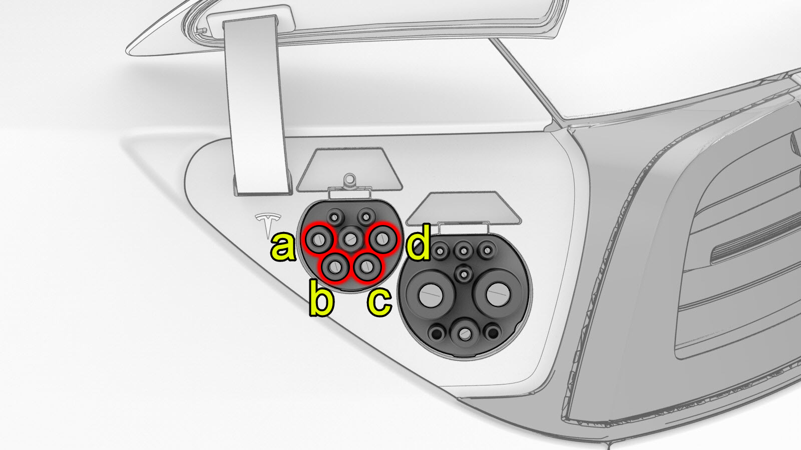 9. Use the multimeter to check voltages at the lower 4 terminals of the charge port AC connector.