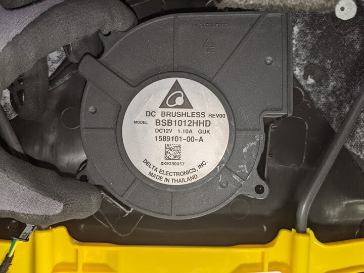 Release tabs securing fan cover onto seat back and remove fan from front seat back