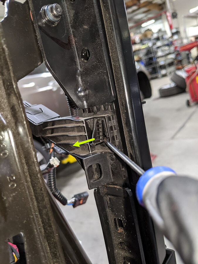 NoteExpose head rest locking springs, Springs are located on the RH side of head rest posts. Use flat head screwdriver to pry for additional clearance if needed. Pull headrest away from seatback.