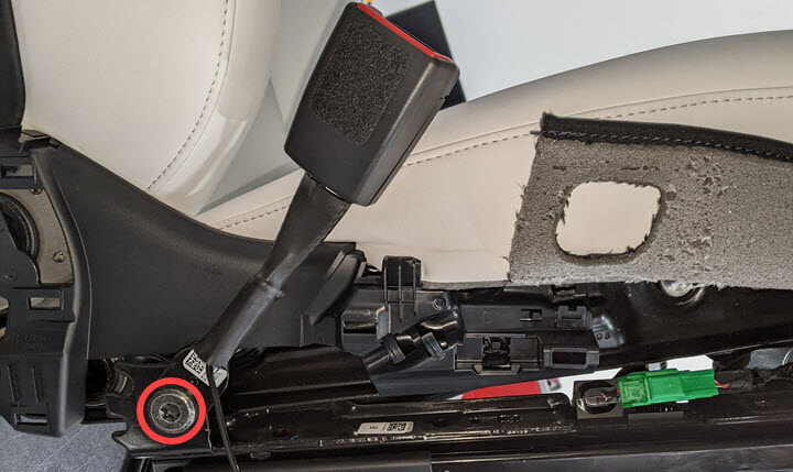- Cut LH front seat buckle harness