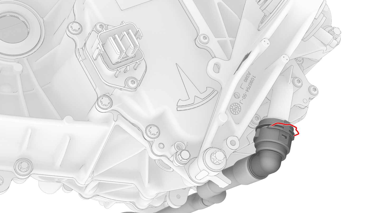 - Install the clip that attaches the front drive unit inverter inlet hose to the exterior of the front drive unit gearbox.