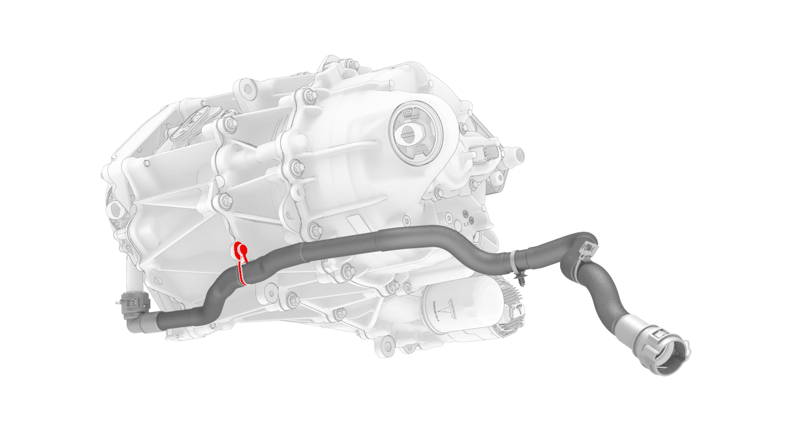 - Release the clip that attaches the front drive unit inverter inlet hose to the exterior of the front drive unit gearbox.