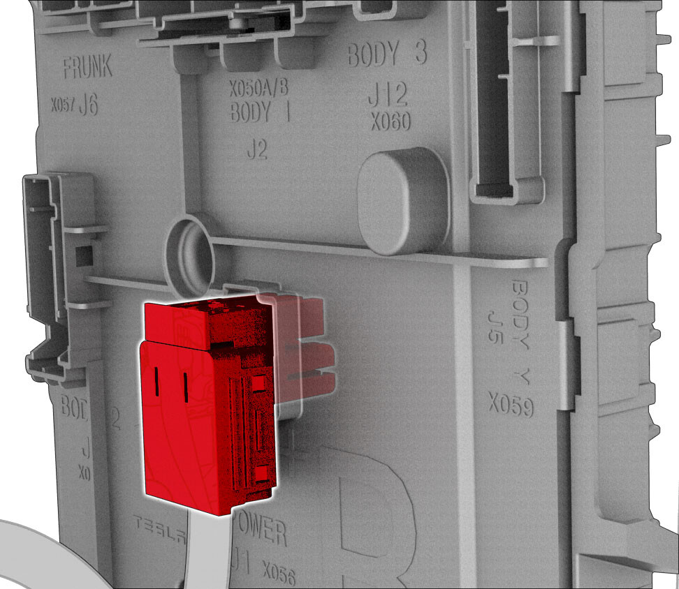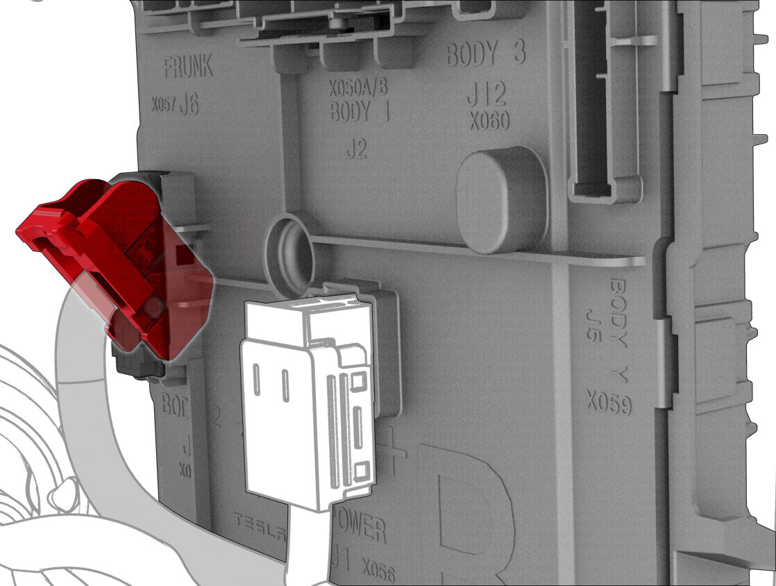 - Release the connector lock, and then disconnect the J1 power electrical connector from the RH body controller module.