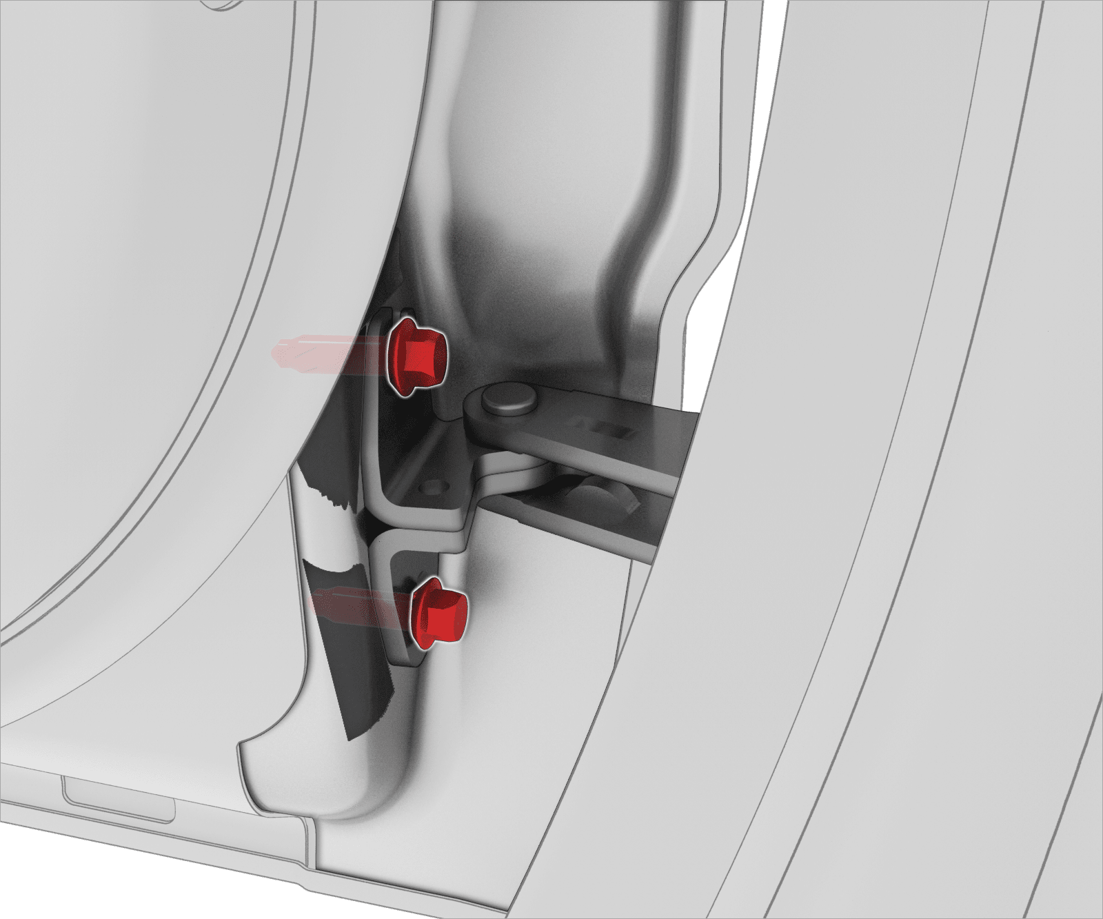 - Remove the bolts (x2) that attach the lower door hinge to the LH rear door.
