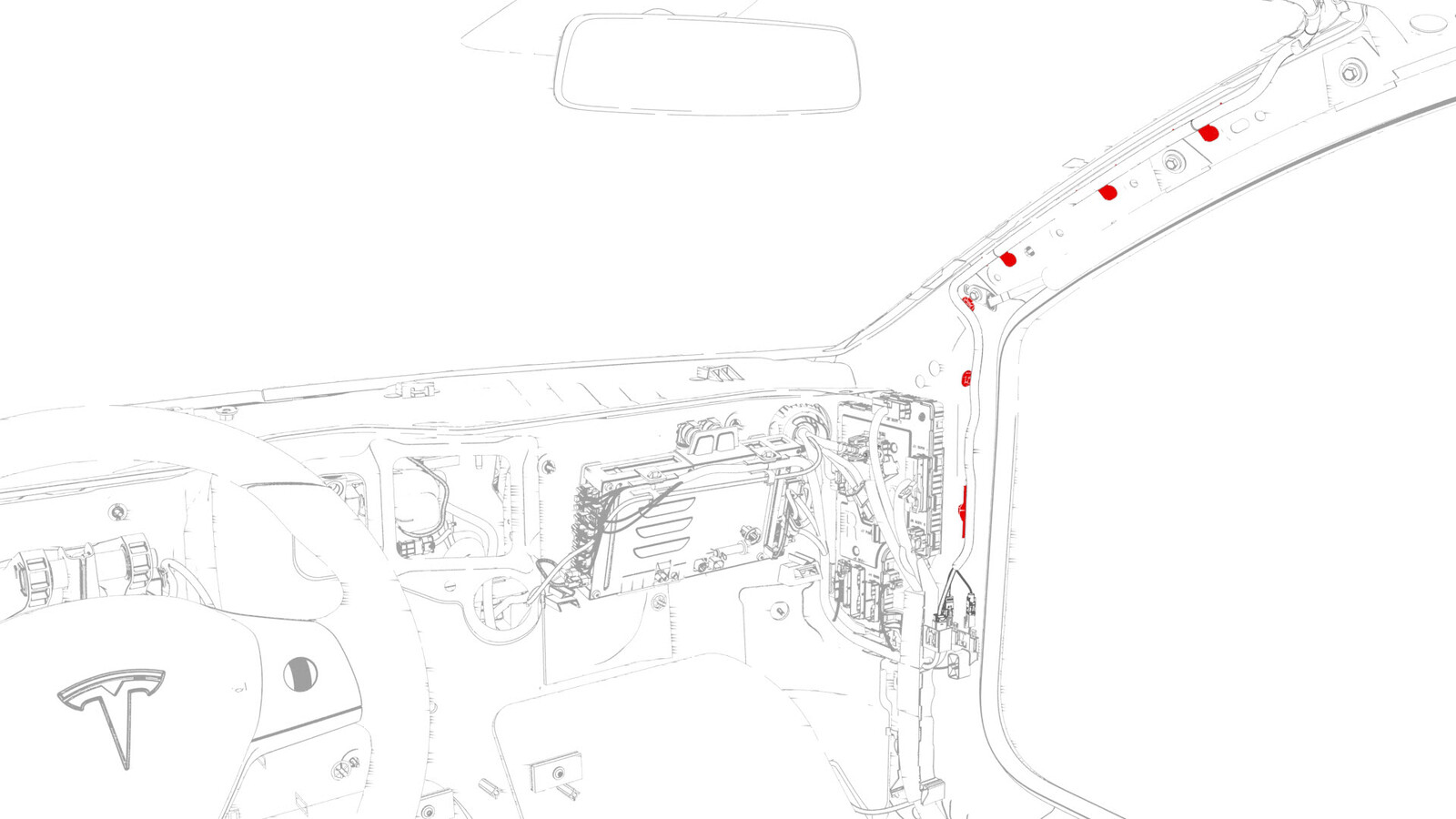 - Release the clips (x6) that attach the windshield harness to the RH A-pillar.