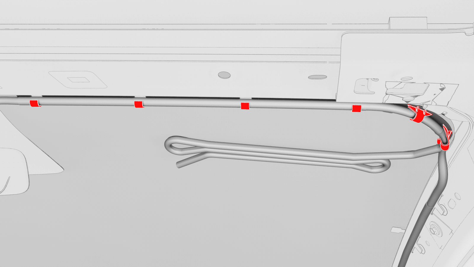 - Fasten the clips (x6) that attach the windshield harness to the RH A-pillar.