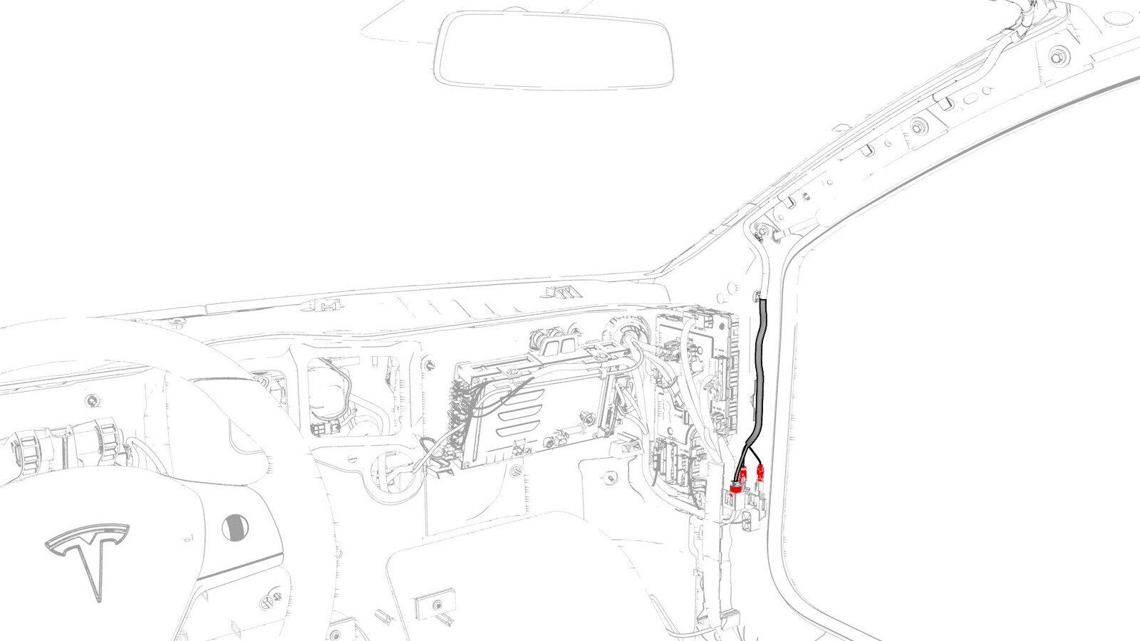 - Move the windshield harness down through the opening on the instrument panel, and then connect the windshield harness electrical connectors at the lower A-pillar.