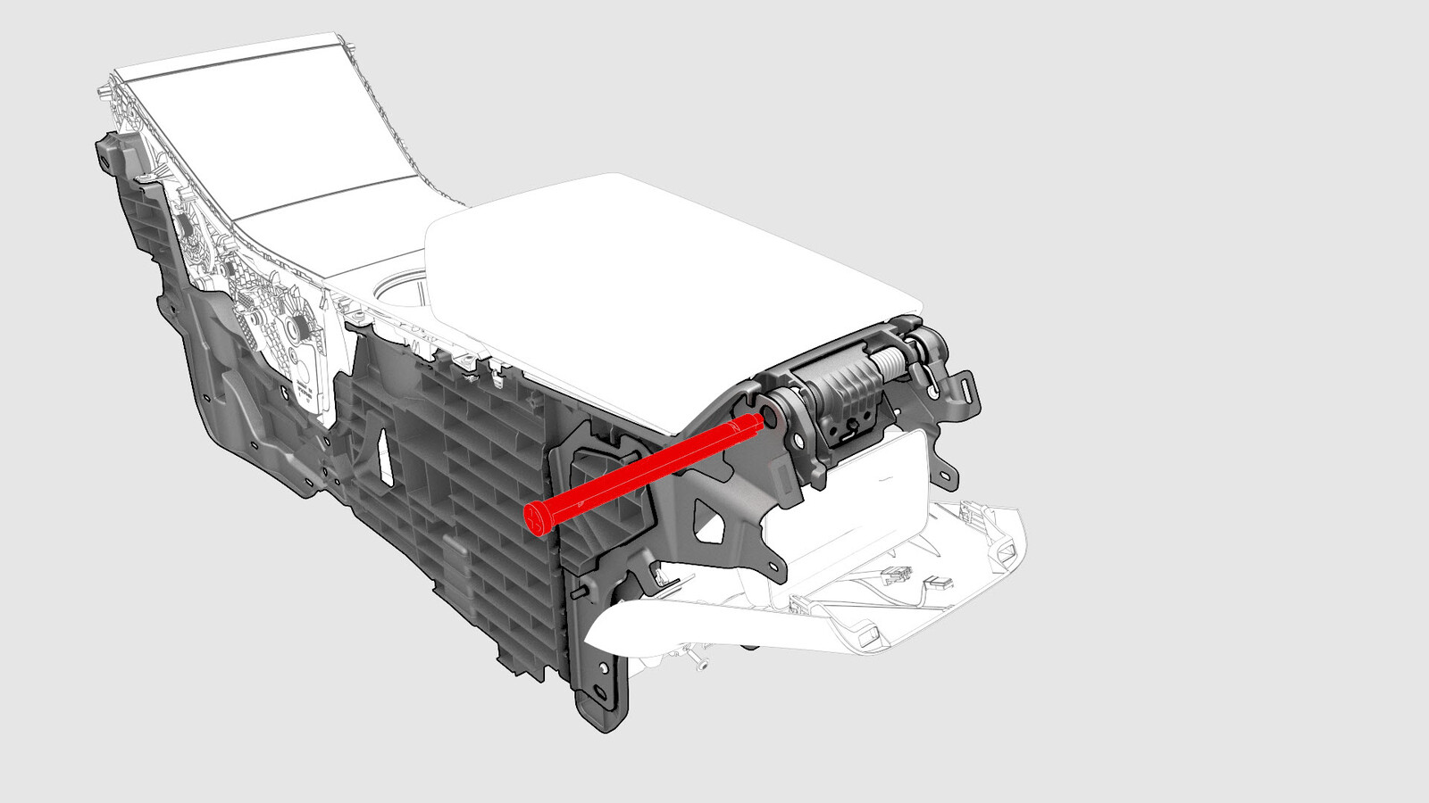 Close the armrest, and then tap towards the LH side with a hammer and pin to remove the armrest hinge pin from the center console.