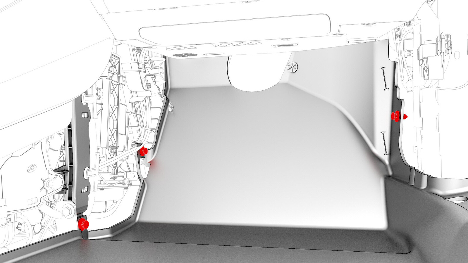 - Remove the clips that attach the front RH carpet to the body, and then fold the front RH carpet rearwards.