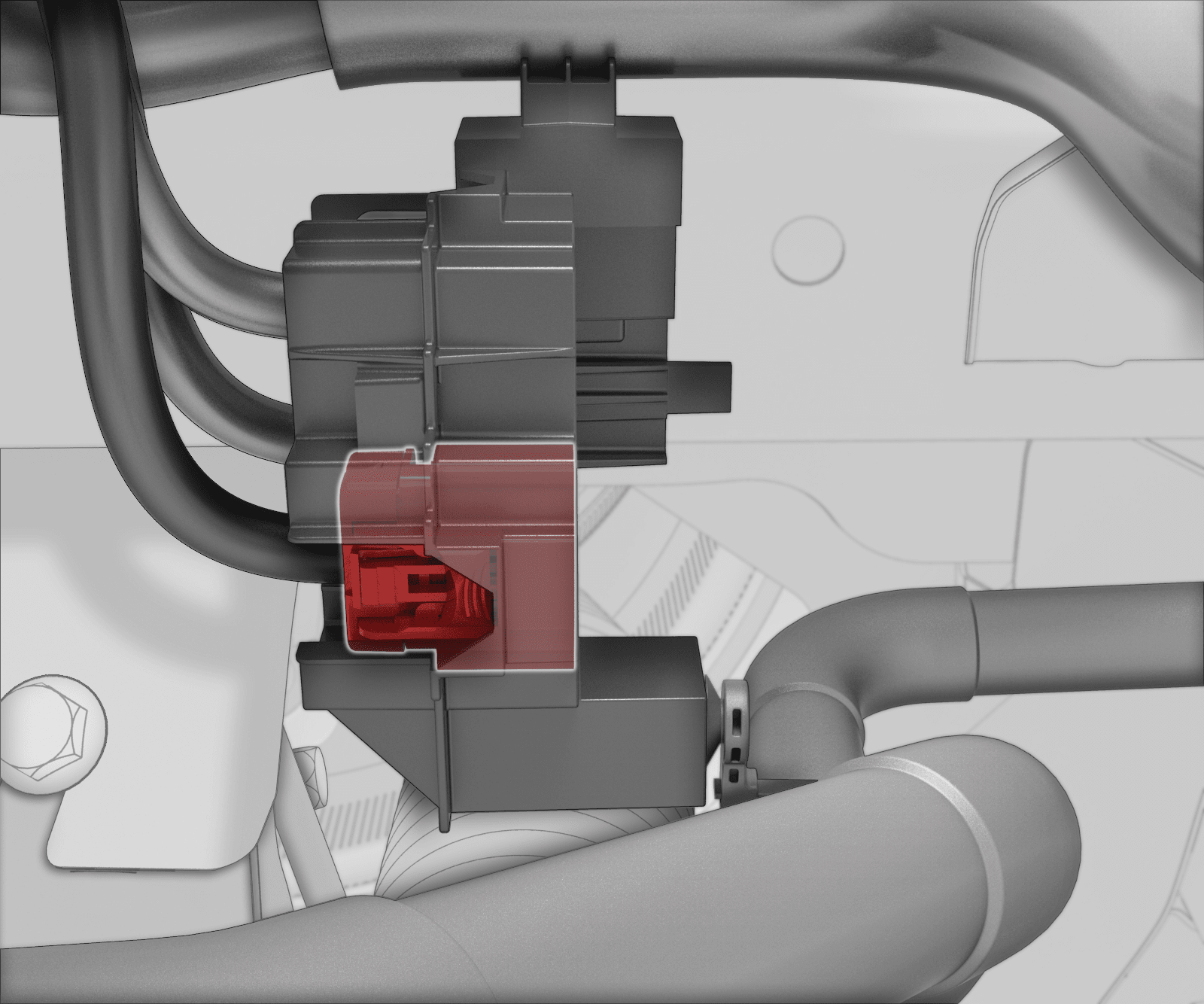 - Disconnect the black inline electrical harness connector located behind the DCDC LV positive cable.