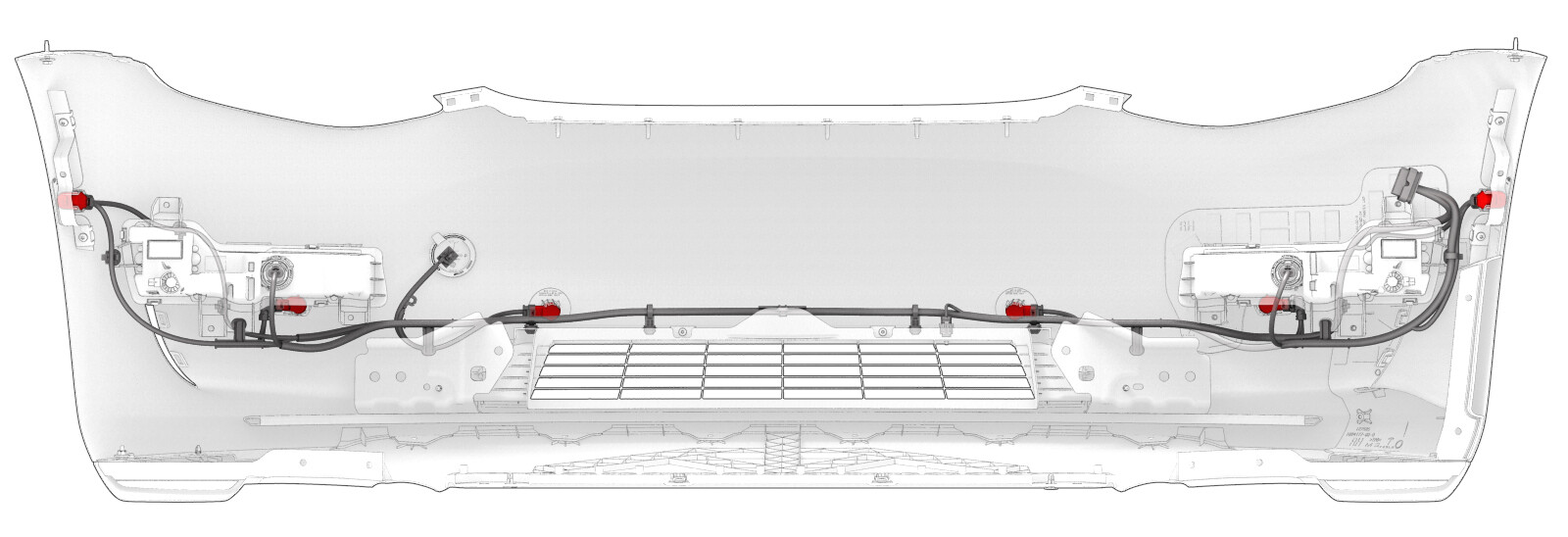 - Install the clips that attach the electrical harness to the center of front fascia.
