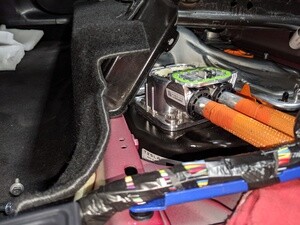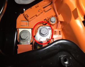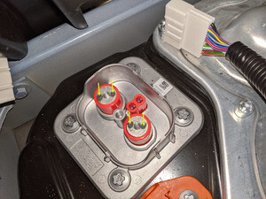 - Remove the bolts (x2) that attach the charge port busbar connector to the busbar HV battery DC input assembly.