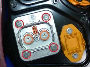 - Remove and discard the bolts (x4) that attach the busbar HV battery DC input assembly to the ancillary bay, and then remove the input assembly from the ancillary bay.