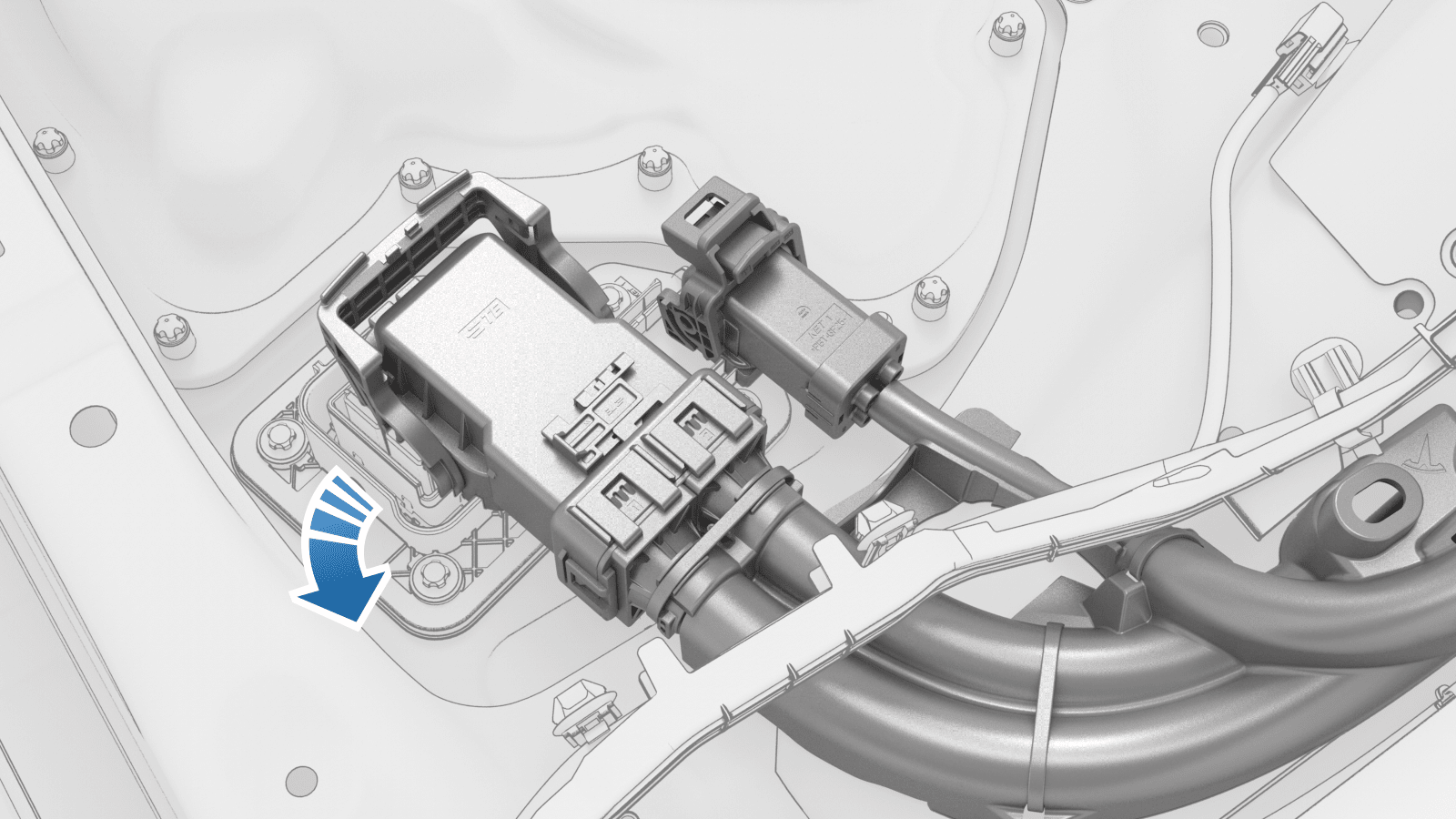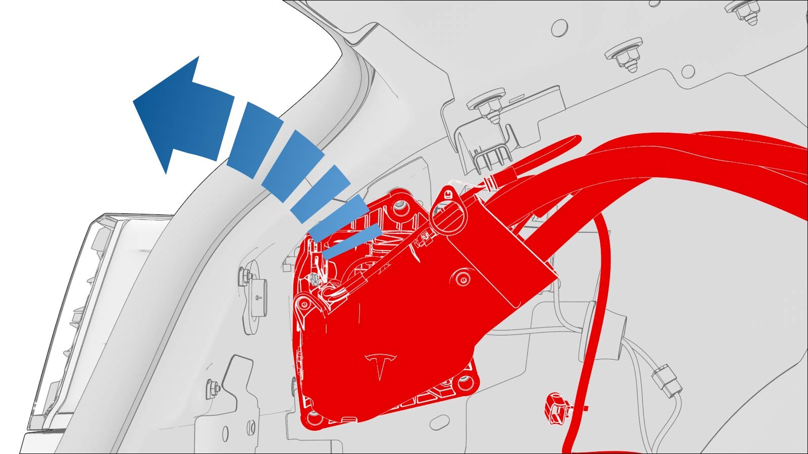 - Release the charge port harness from the body by lifting up the harness reference point up and over the body.