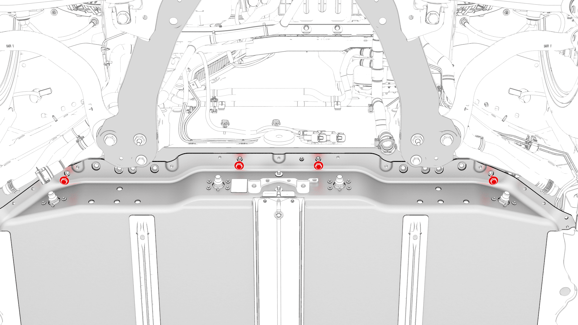 - Install the front HV battery skid plate. See Skid Plate - HV Battery - Front (Remove and Replace).