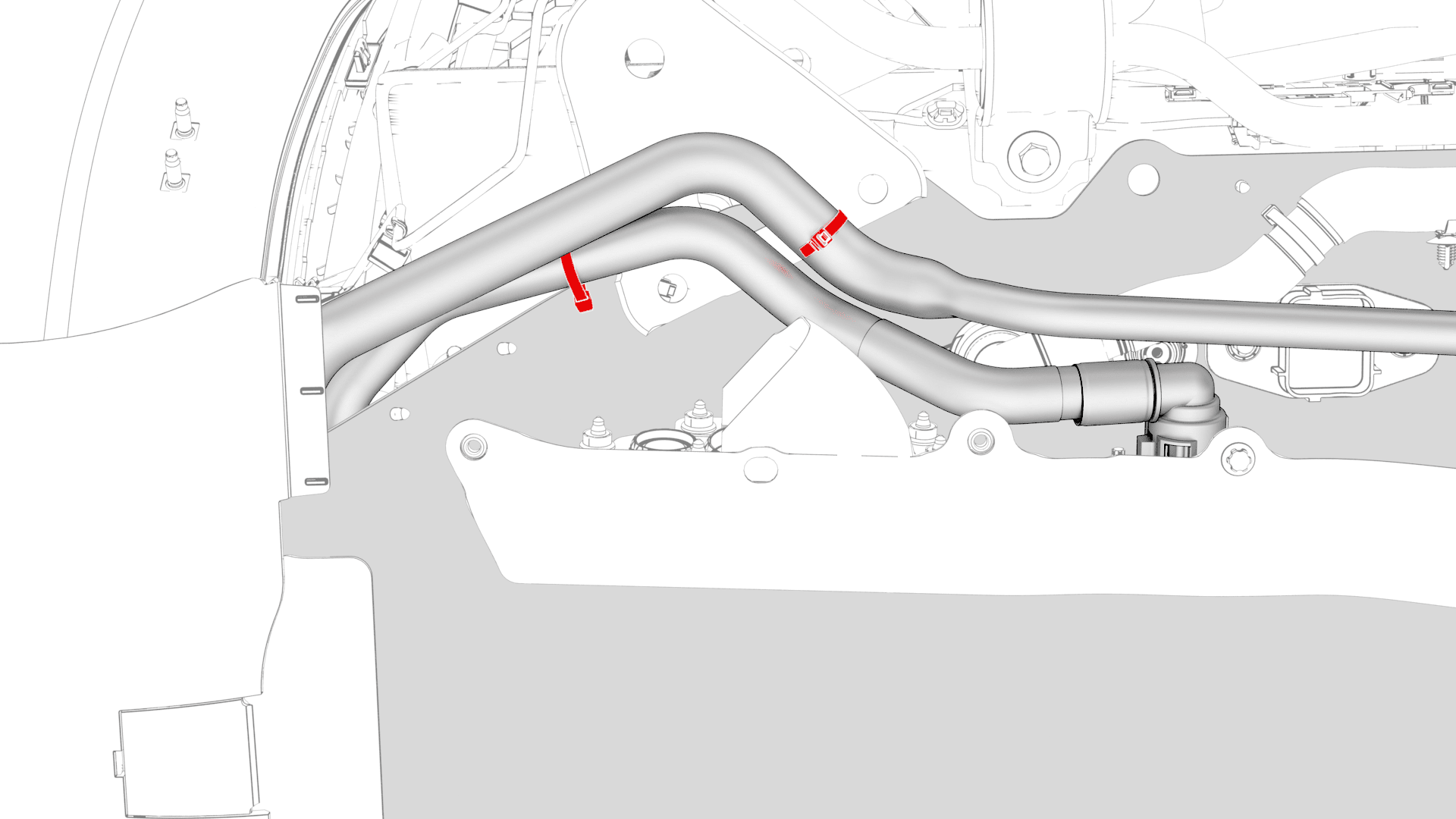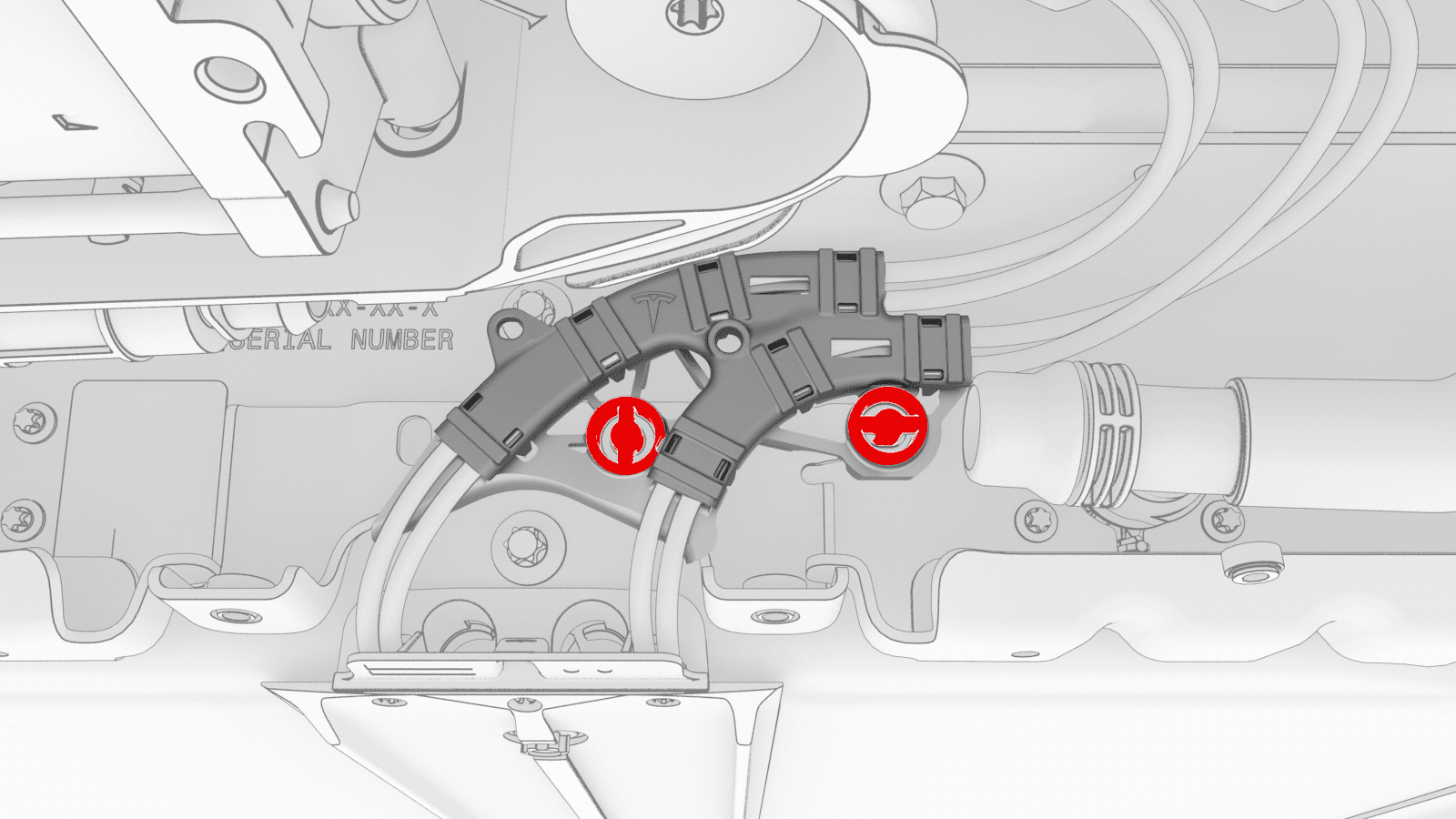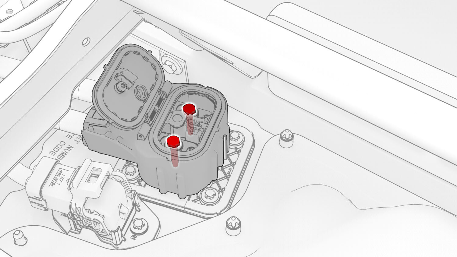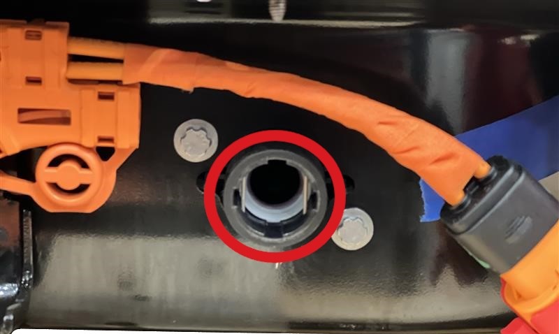 Install the harness clips, and then the bolts that attach the charge port to HV battery harness bracket at the ancillary bay.