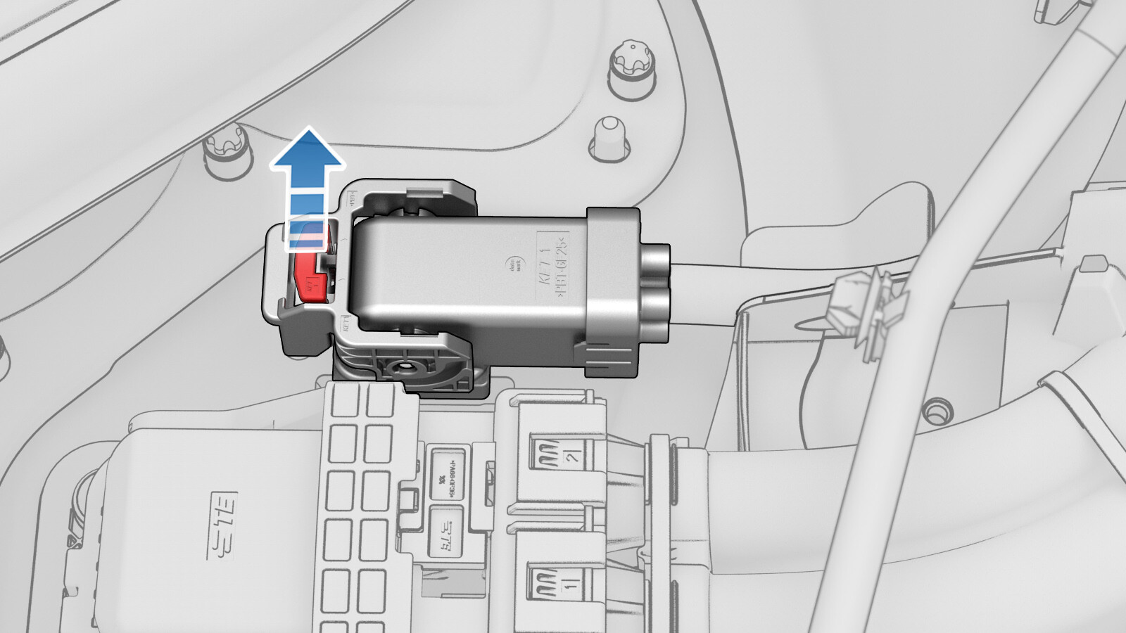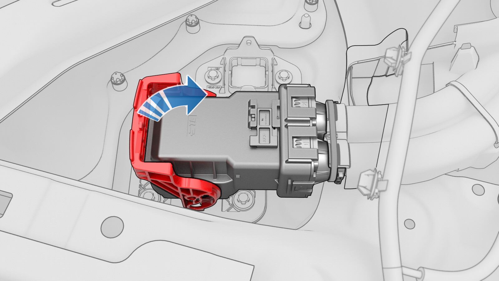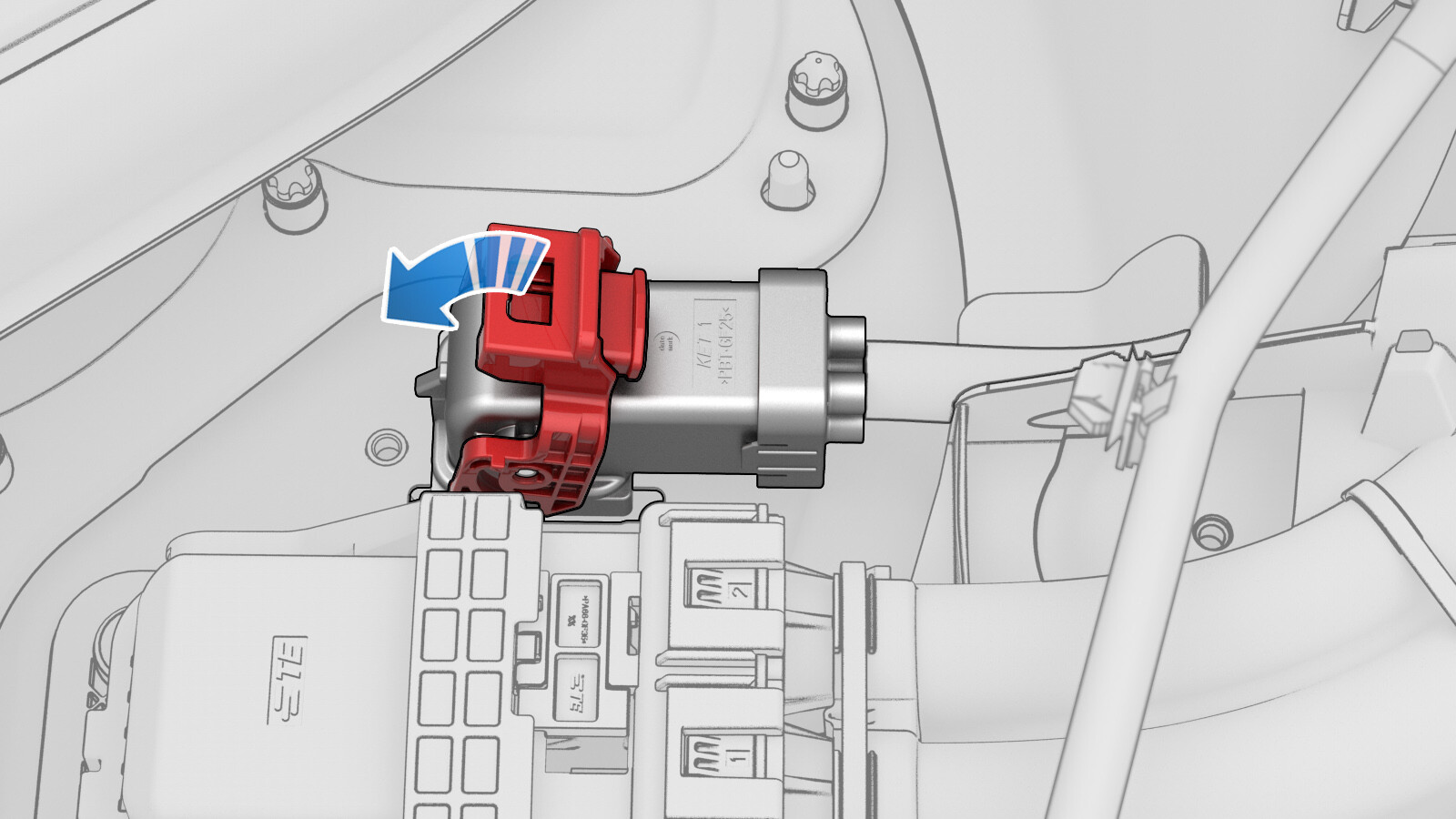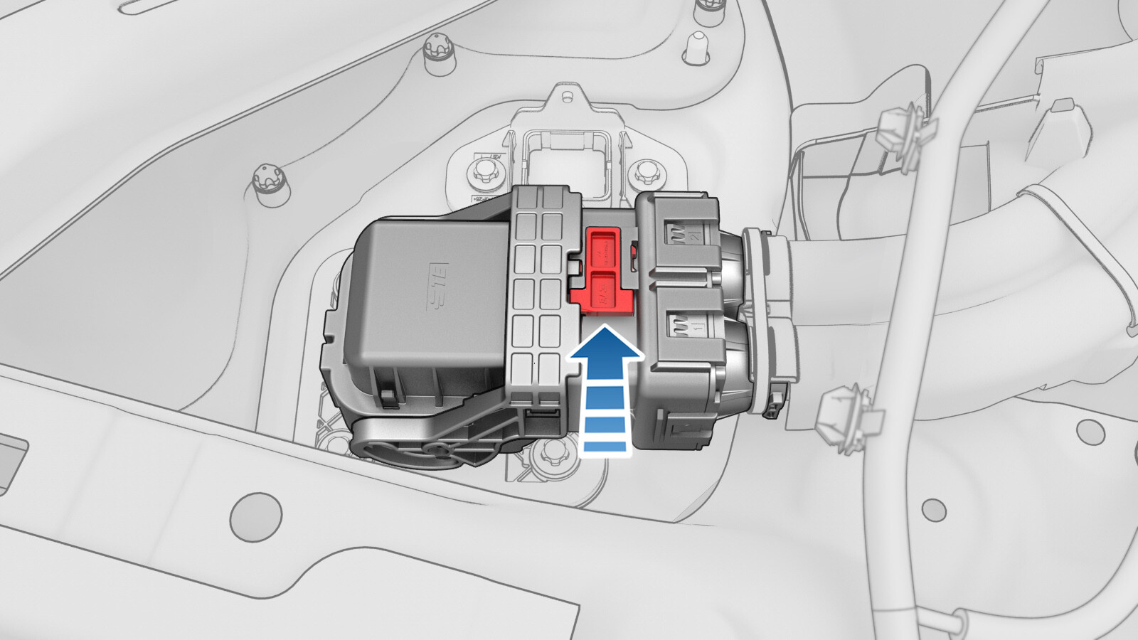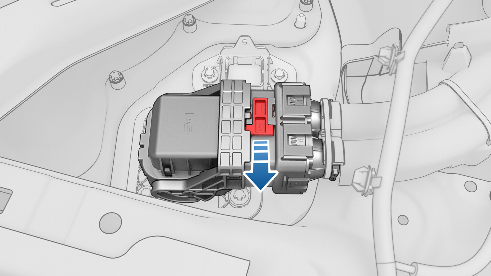 Use both hands to firmly connect the DC input connector of the charge port to HV battery harness to the ancillary bay DC input header.