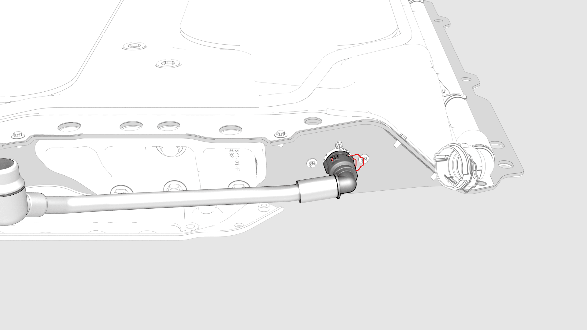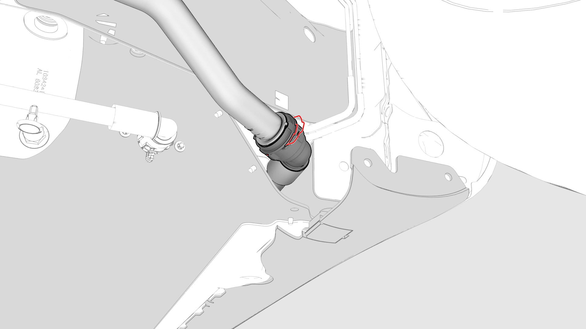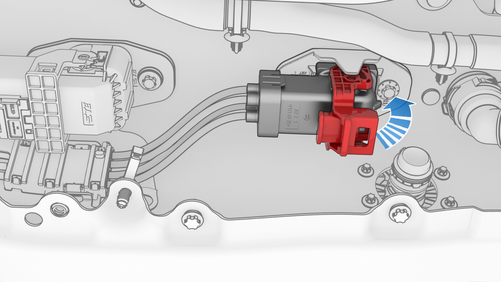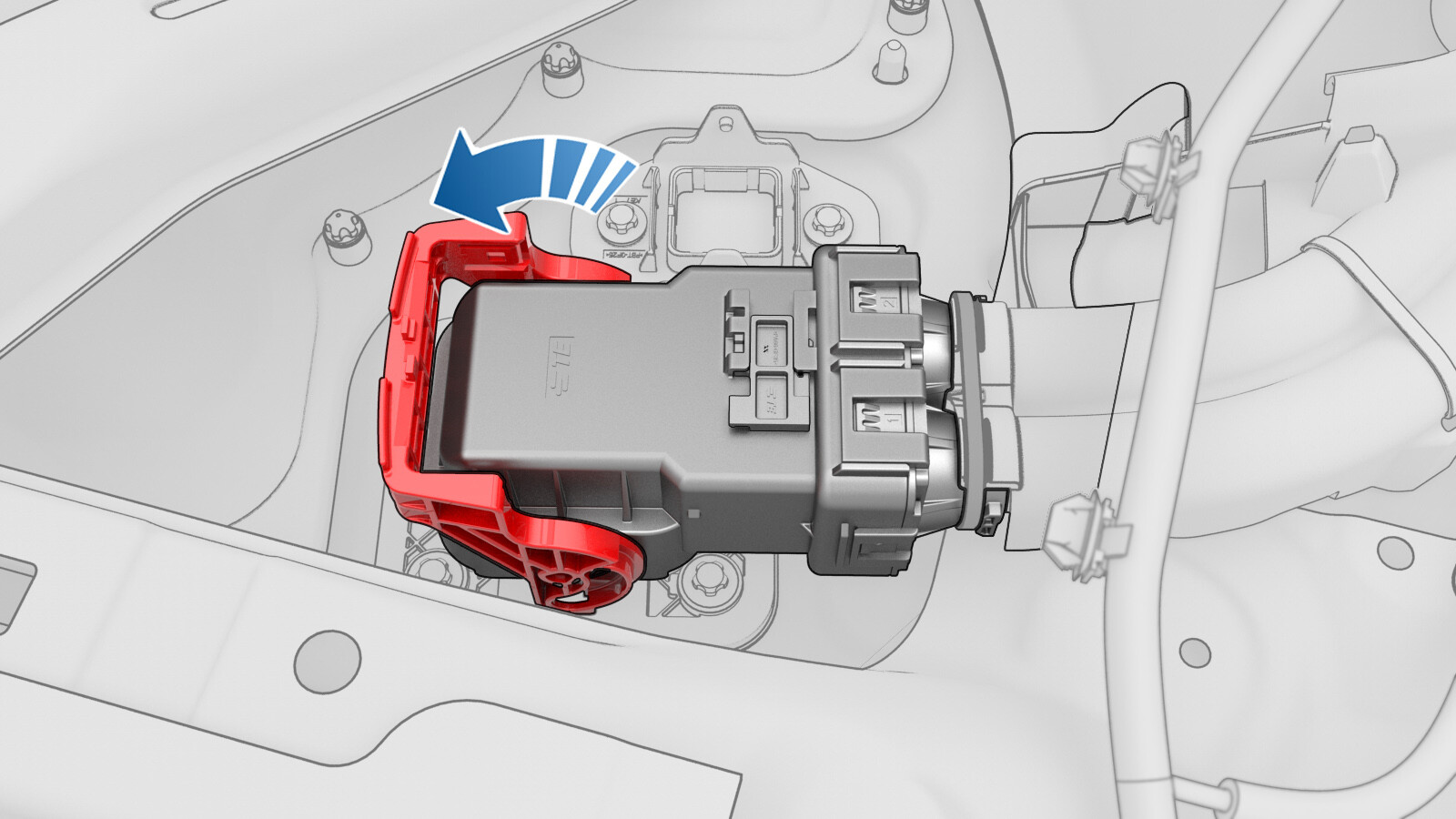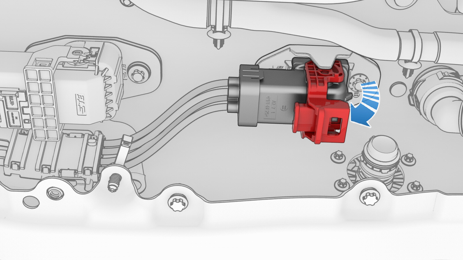 - Install the clip that attaches the charge port to HV harness connector to the LH lower C-pillar.