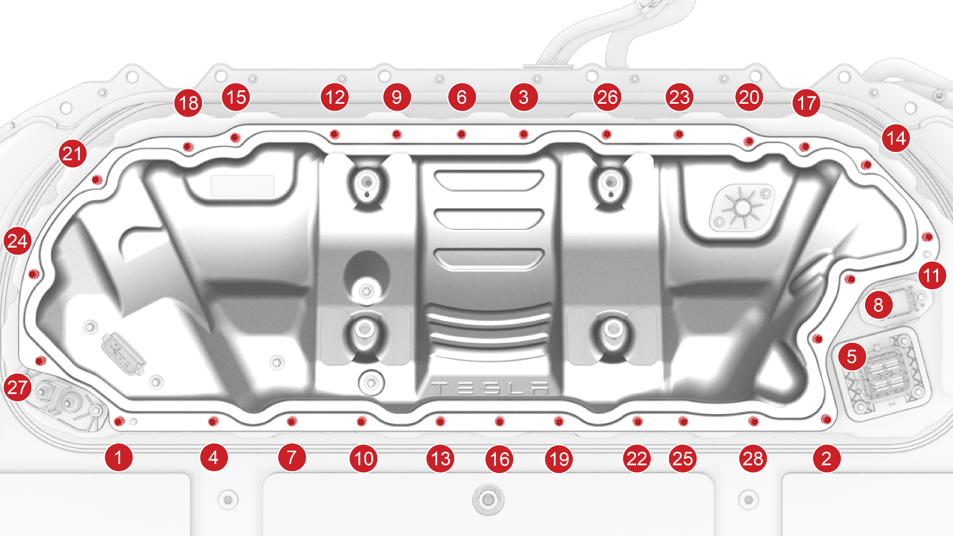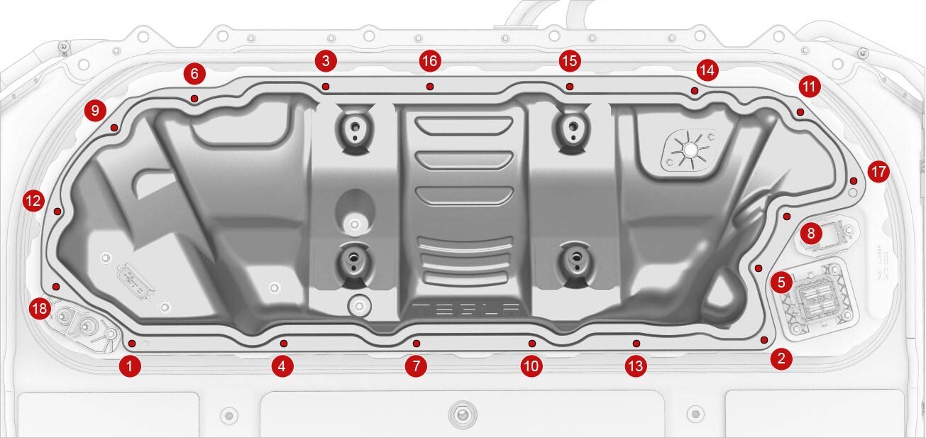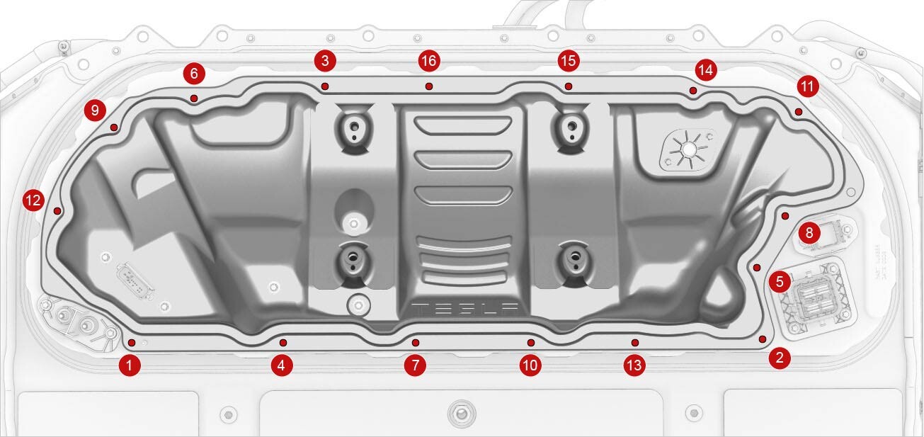 Tighten the 5th RH rear inner bolt that attaches the HV battery to the body.