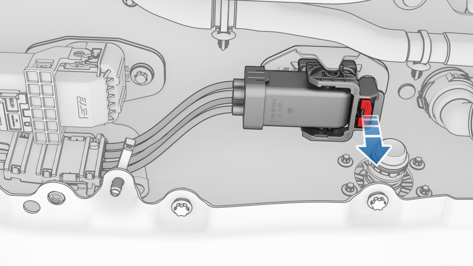 Use both hands to firmly connect the 3-phase connector of the charge port to HV battery harness to the ancillary bay 3-phase header.