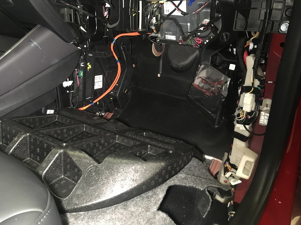 - Release the electrical harness from the 2x clips on the RH front main carpet, and then fold the carpet back.