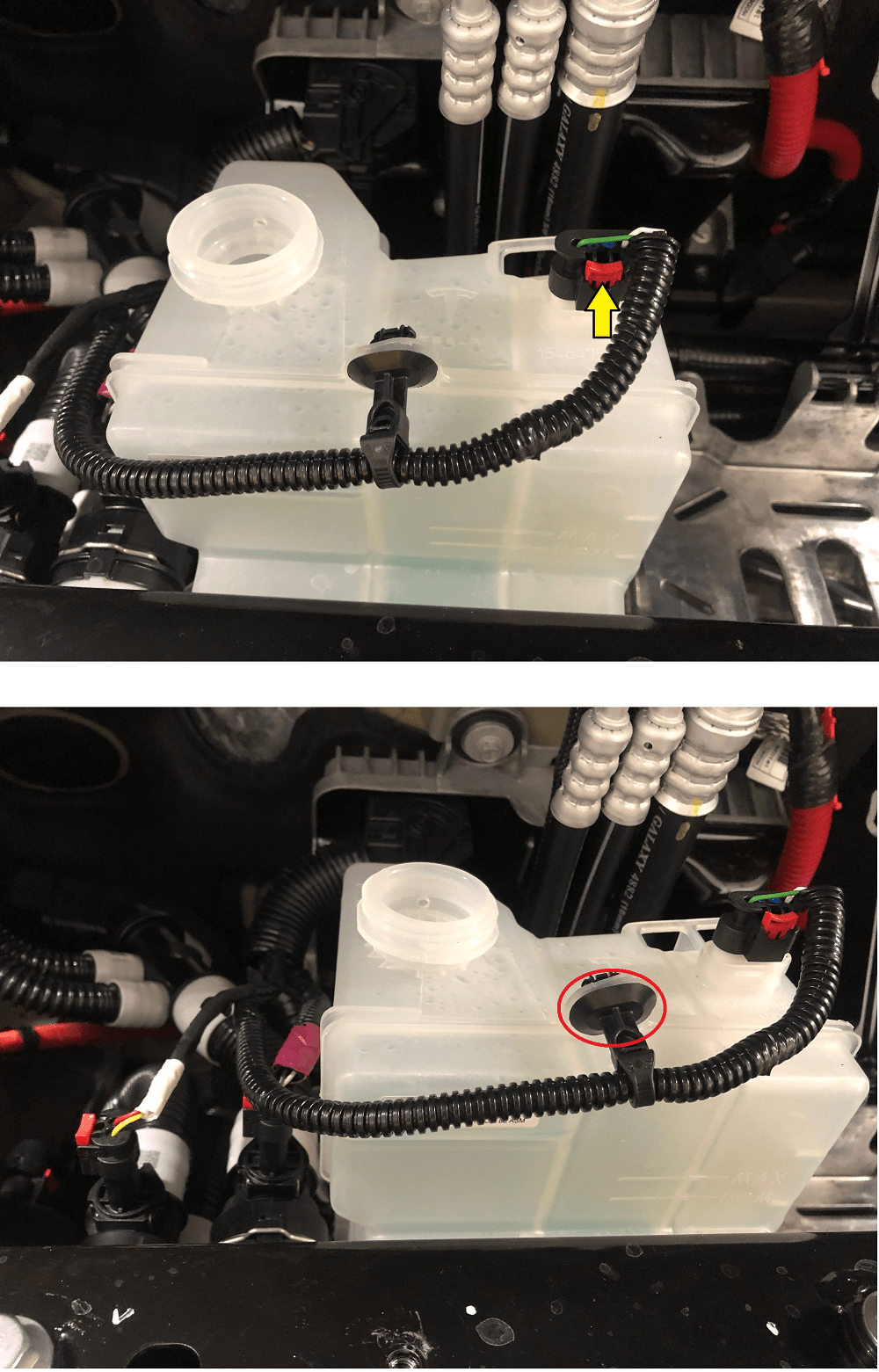 - Remove the thermal sub assembly harness clips on the RH side and bottom left of the coolant reservoir.