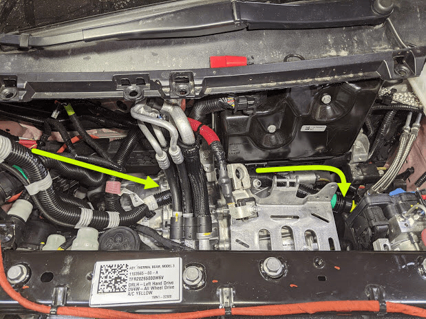 - Disconnect the chiller to battery hose and the powertrain supply hose from the supermanifold.