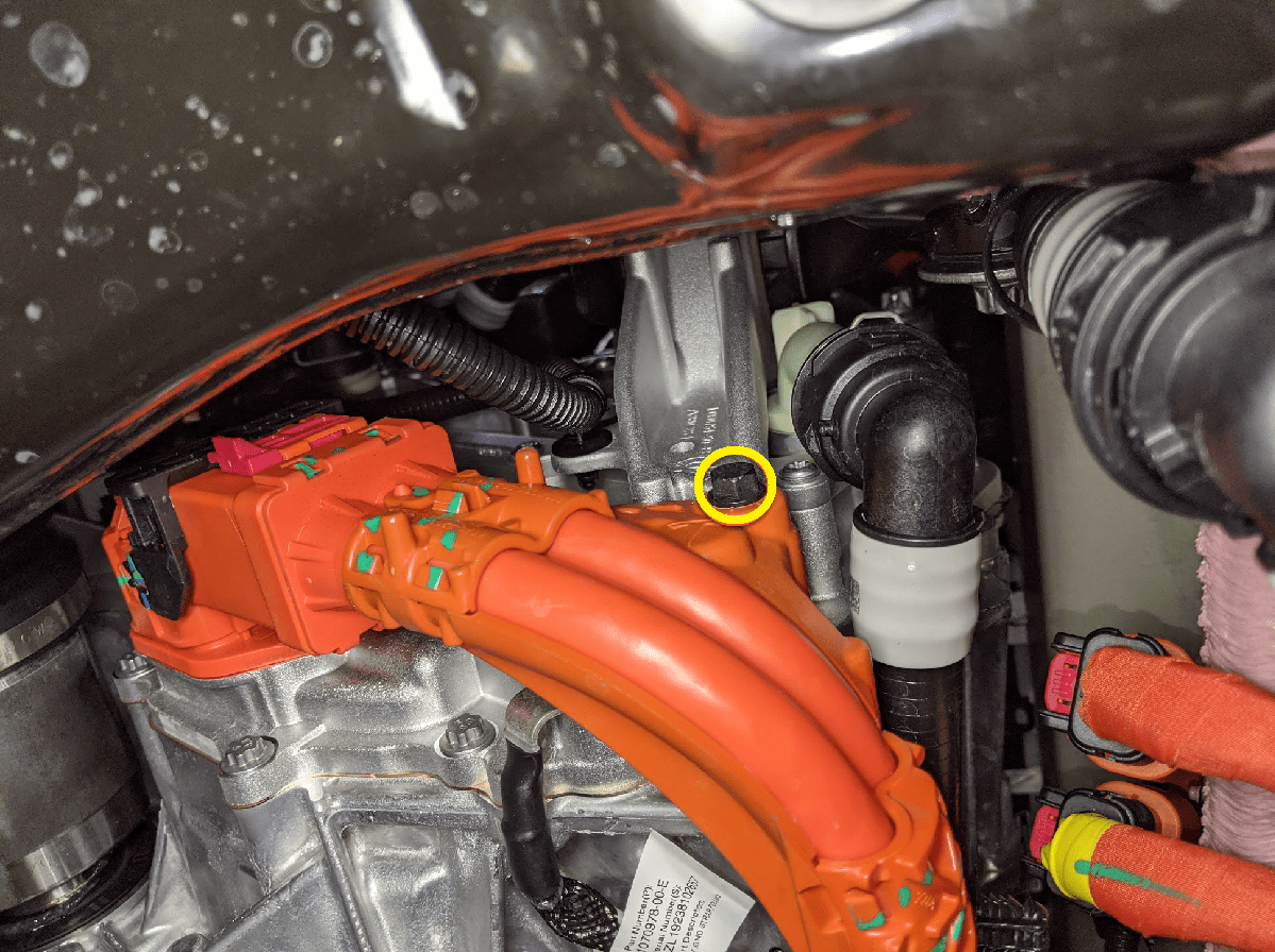 - Remove the bolt (10 Nm) that secures the front drive unit HV harness to the front drive unit.