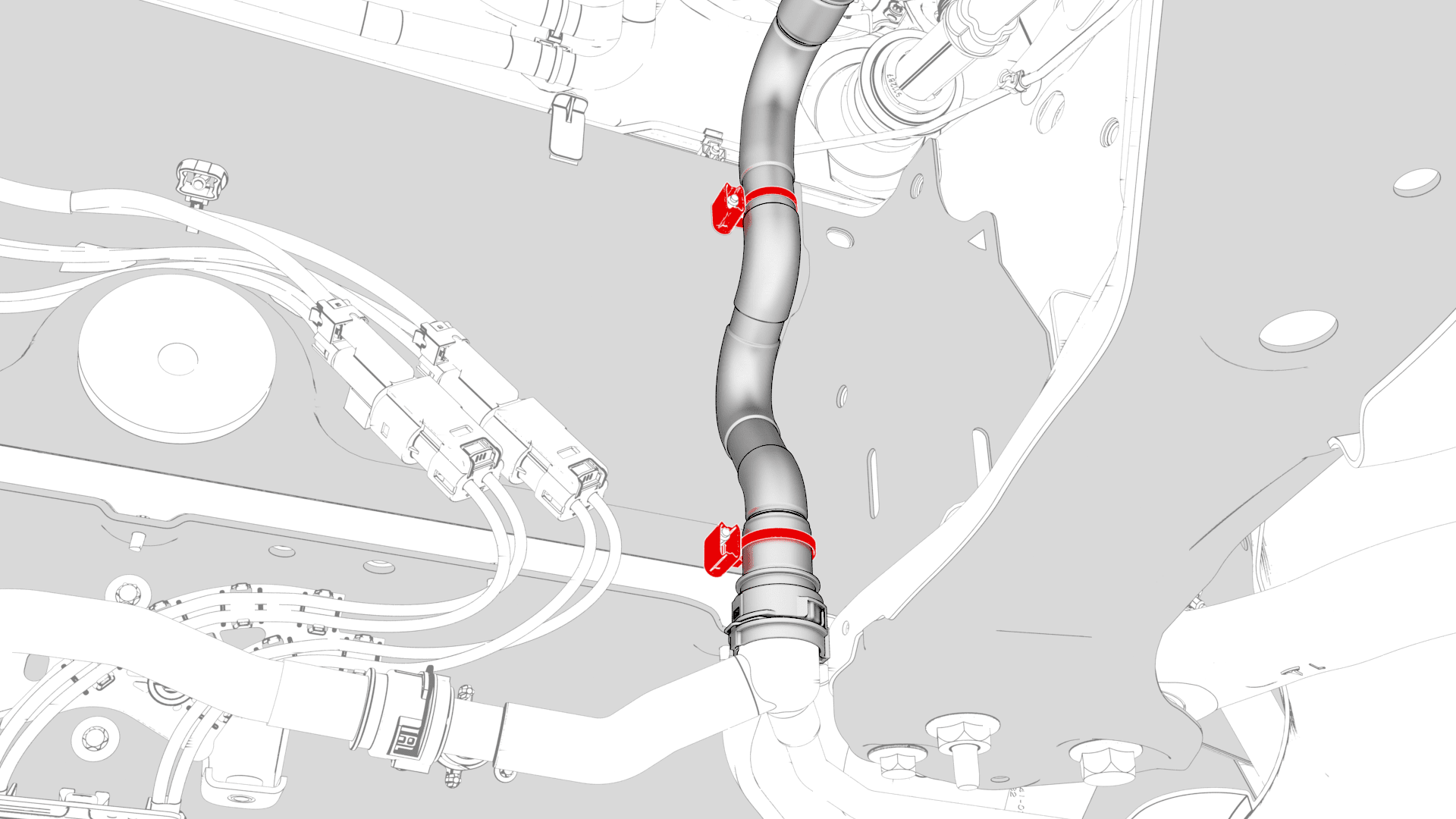 - Disconnect the battery to chiller hose at the LH side of the vehicle, plug the female fitting of the hose, and allow the battery to drain.