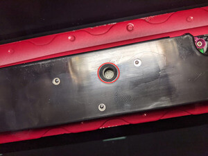 - Pry open the LH rear coat hook screw cover with a small flat head screwdriver.