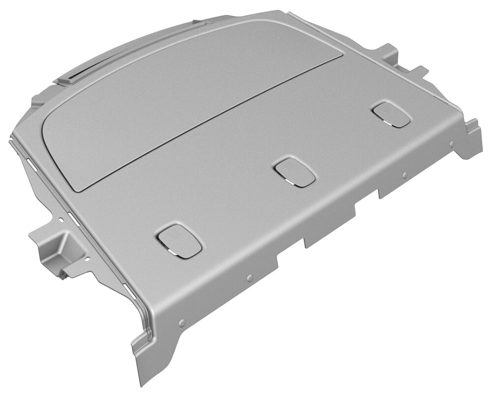 - Release the tabs that attach the package tray trim to the body, and then slide the package tray forward to remove it from the vehicle.