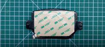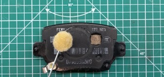4. Align the NVH stickers to the back side of the inner rear brake pads (x2), and then apply pressure on the pieces of NVH tape to adhere them to the brake pads.