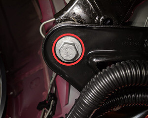 - Install the RH shear plate to the rear subframe, and then install a new large bolt to attach the RH shear plate and rear subframe to the body.