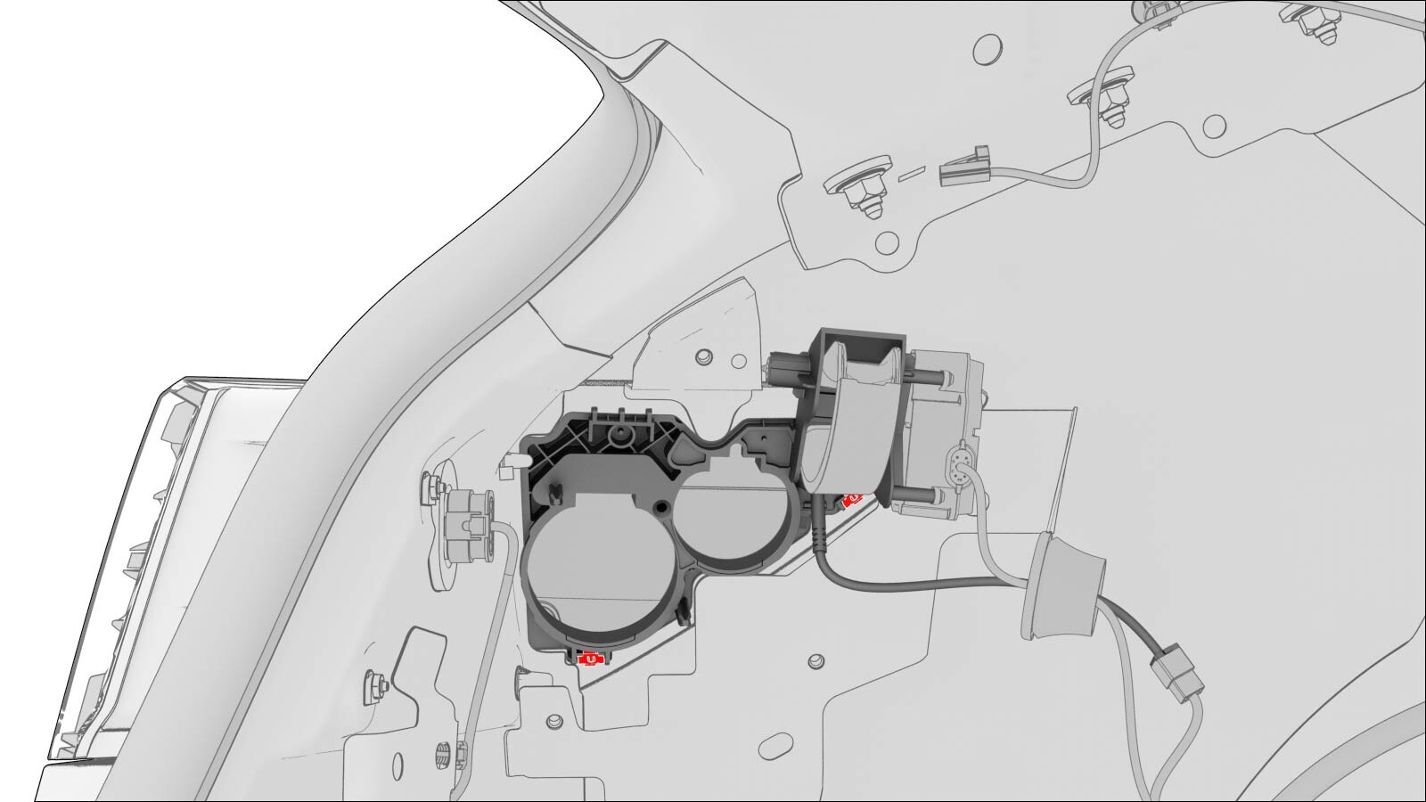 - Connect the low voltage harness connectors (x2) on the charge port, and then install the locking tabs (x2) that secure the connectors.