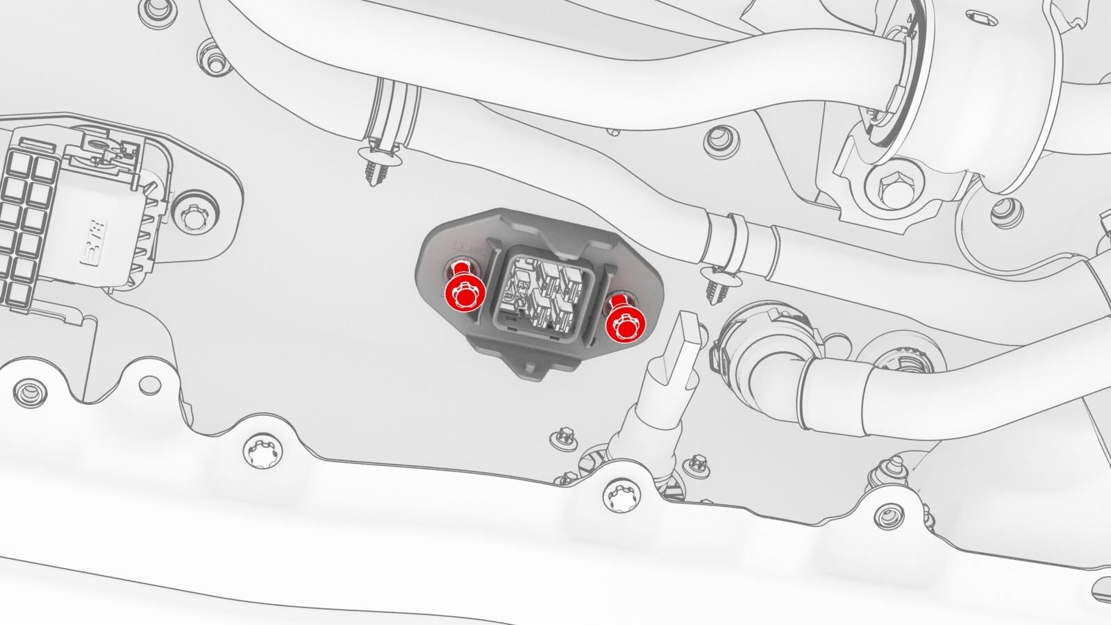 - Remove the bolts (x2) that attach the PTC heater and A/C compressor HV header to the HV battery.