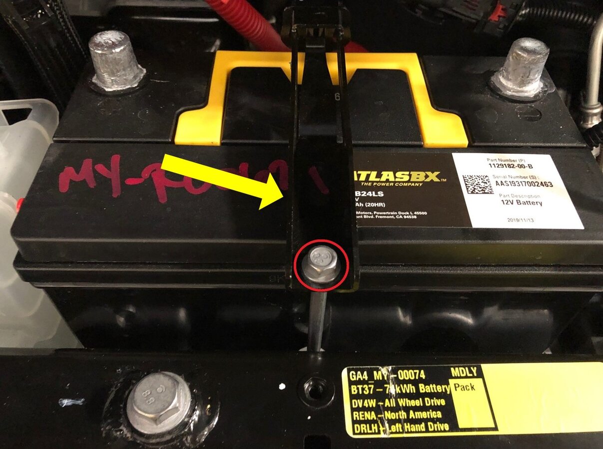 Note1x bolt, 10mm, 5 Nm, Lift battery tie down strap up and remove it from rear tie down hook strap