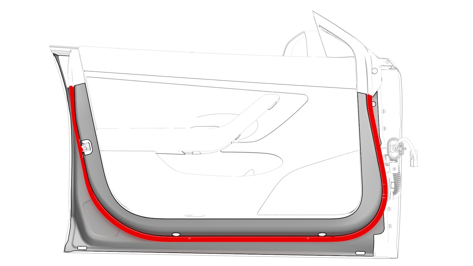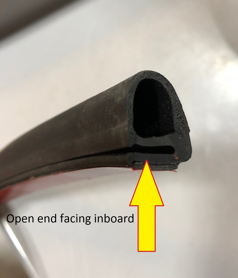 NoteMake sure that the open edge of the seal is facing the inside of the door.NoteMake sure the front edge of the seal is under the cutout for the glass run seal, and the rear edge is under the cutout for the inner belt seal.NoteMake sure that the drain holes of the seal are at the bottom of the door.