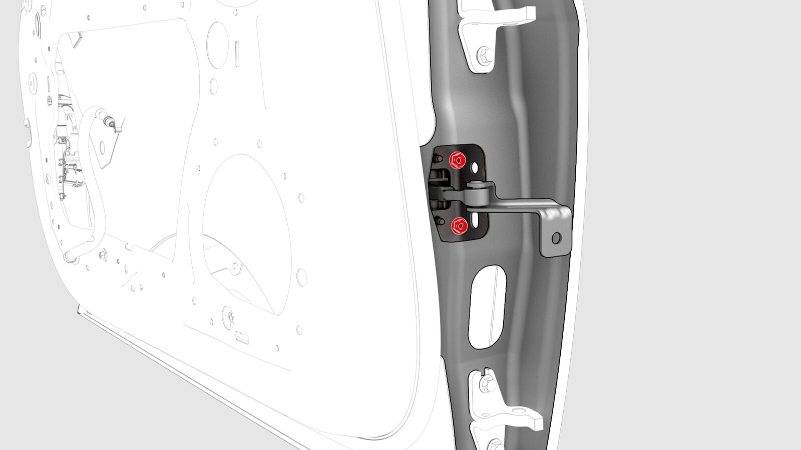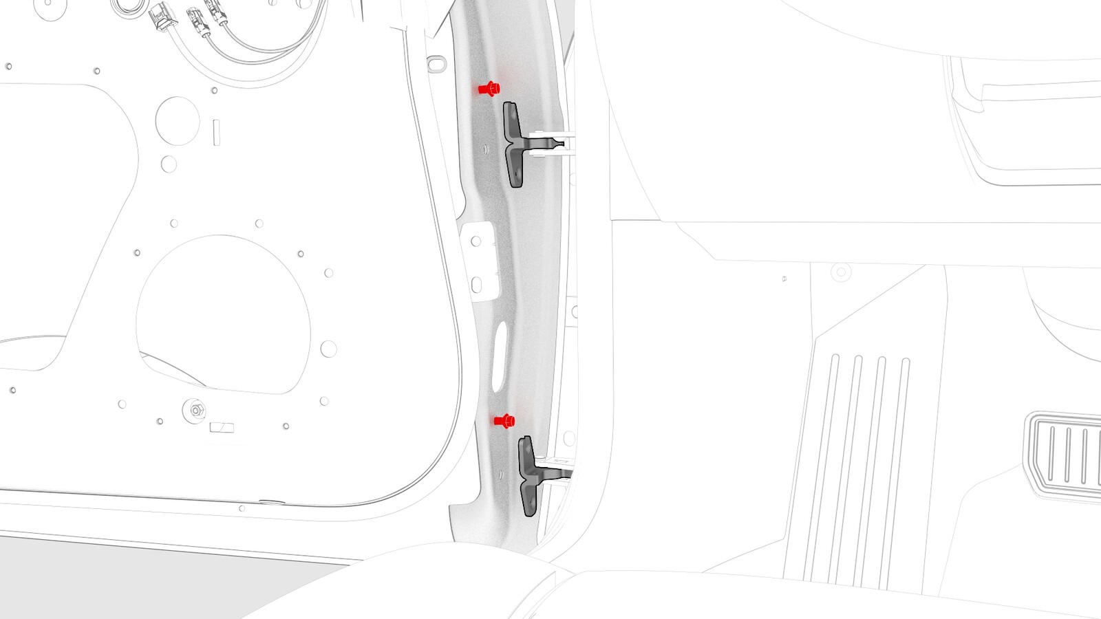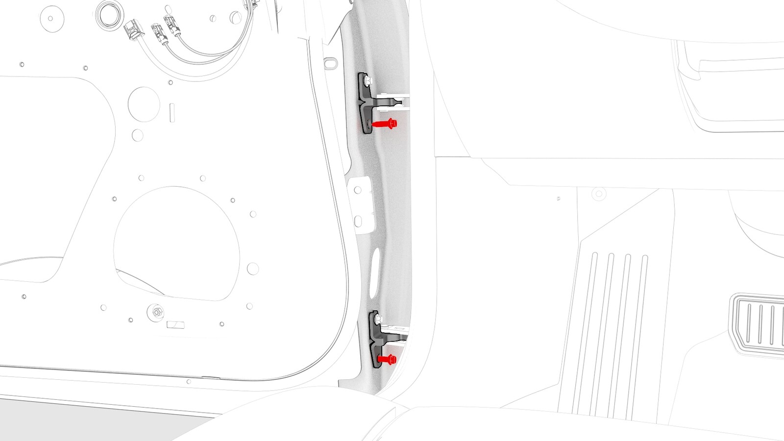 | Bolts that attach the LH front door to the hinge |