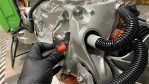 - Pull on red release tab, pull tab again to disconnect the rear subframe electrical harness from the rear drive unit resolver connector, release the clips (x2) that attach the electrical harness to the RH side of the rear drive unit, and move the electrical harness aside.