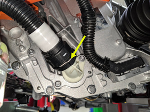 - Release the clip, disconnect the powertrain coolant supply hose from the rear drive unit inverter, and then immediately plug the fitting for the inverter.