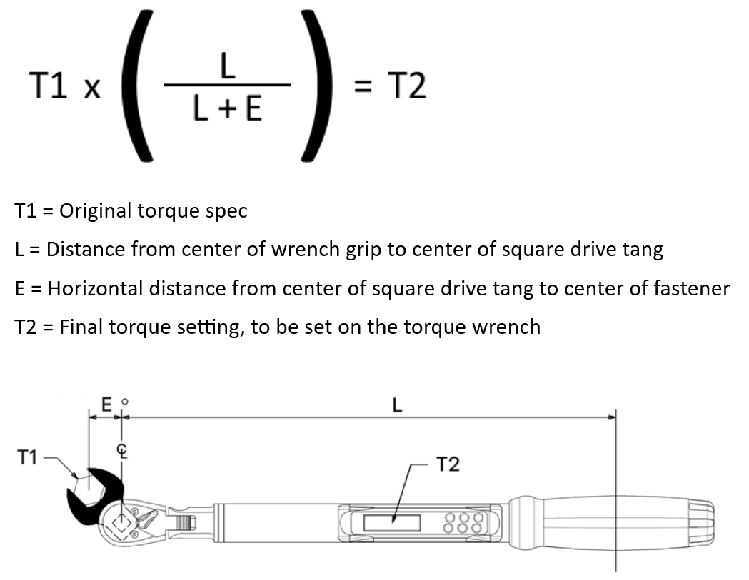 Attaching a crowsfoot/offset extension to a torque wrench (Figure 1) might affect the amount of torque that is being applied to the fastener. The formula to calculate the torque wrench setting when using a crowsfoot/offset extension is described in Figure 2. To access the tool to perform this calculation, click Torque Calculator near the upper right corner of the Service Manual.