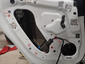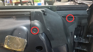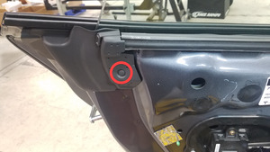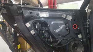 - Remove plugs (x2) that cover the openings in LH rear door to access the LH rear door regulator mounting guides.