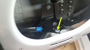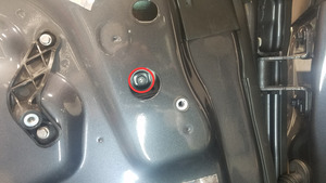 - Remove the plug and butyl patch that cover the LH rear door regulator upper mounting nuts.