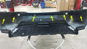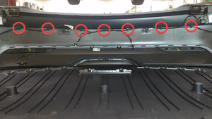 - Position the harness on the rear fascia, and then install the clips (x8) and adhesive pads (x4) that attach the harness to the fascia.