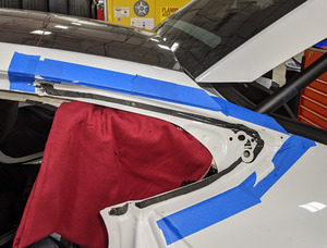NoteStart by positioning the datum into place. Verify the threads for bolt installation are aligned with the body. Apply pressure to the surrounding areas. Use tape to hold glass in place. Reference urethane being applied to confirm dry time.