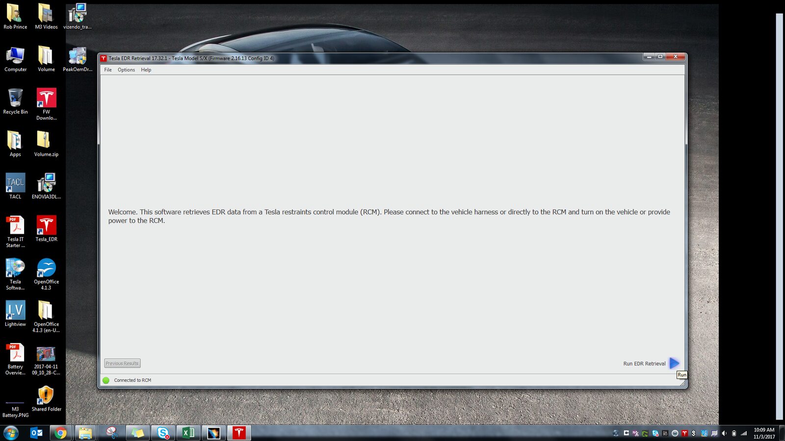 Open the Tesla EDR Retrieval Program. The program automatically attempts to connect to the RCM.
