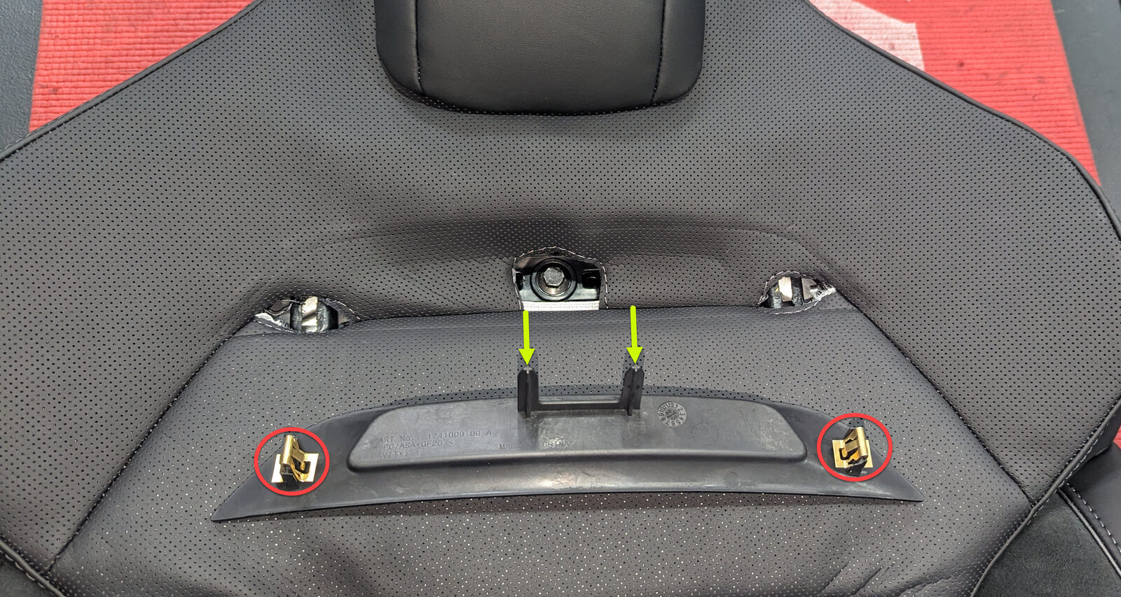 Note2x Clips, 2x datums, Push décor assembly into seat frame, Replace damaged clips