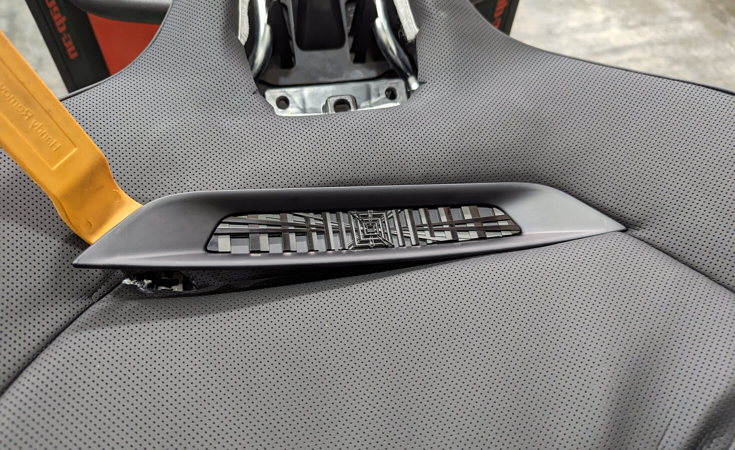 Note2x Clips, 2x datums, Insert pry tool beneath clips on applique, one on each side of décor